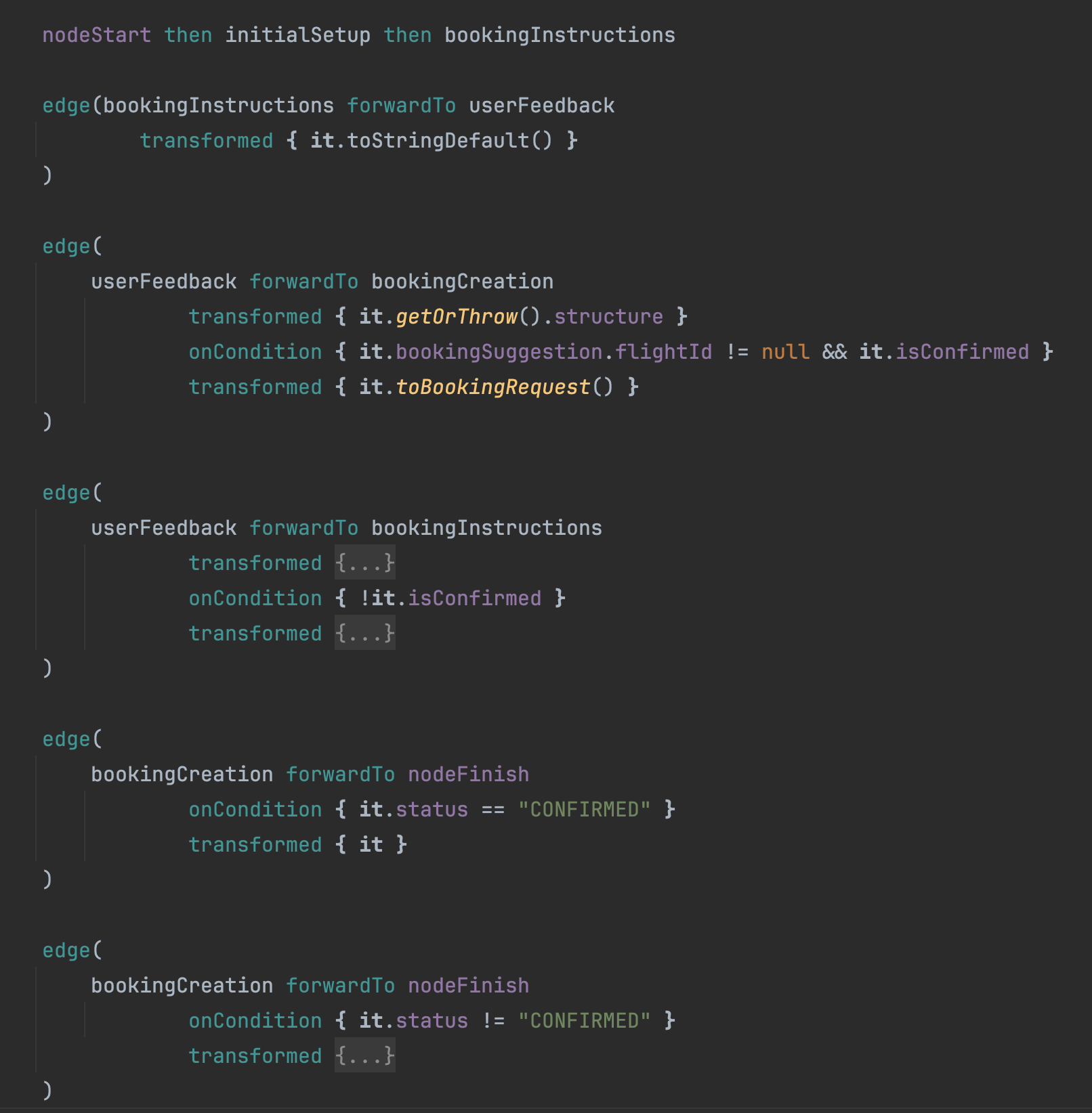 Using the Koog DSL, you can define this workflow by creating nodes and connecting them with edges.
