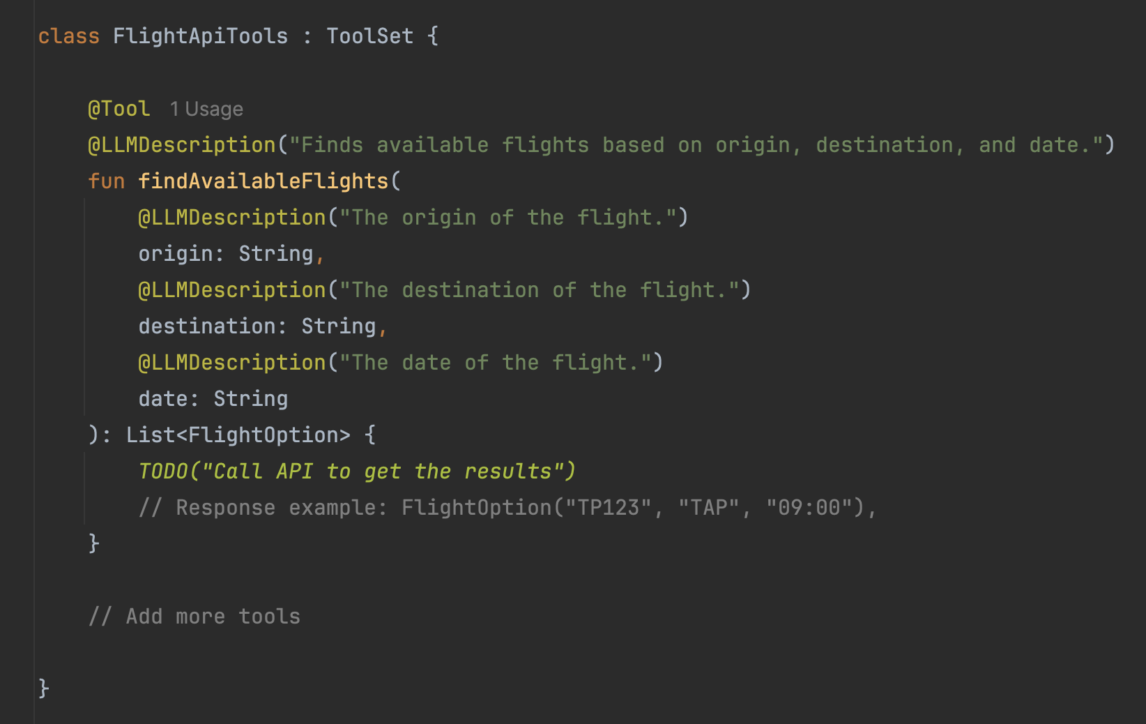 Based on the official Koog documentation, you can define a set of tools in a simple Kotlin class. The @Tool